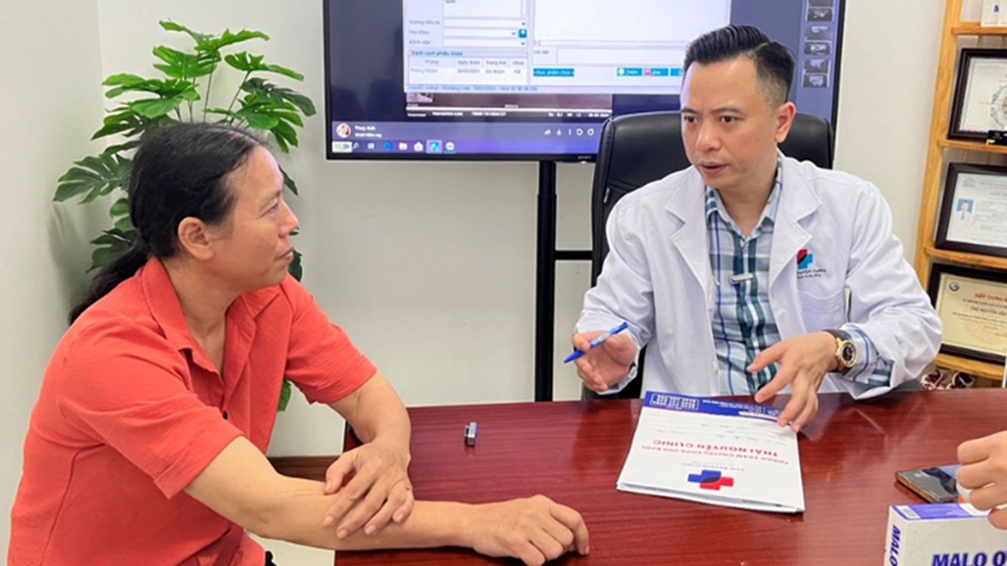 Bác sĩ tư vấn cho bệnh nhân về bệnh tuyến giáp – Ảnh: BSCC